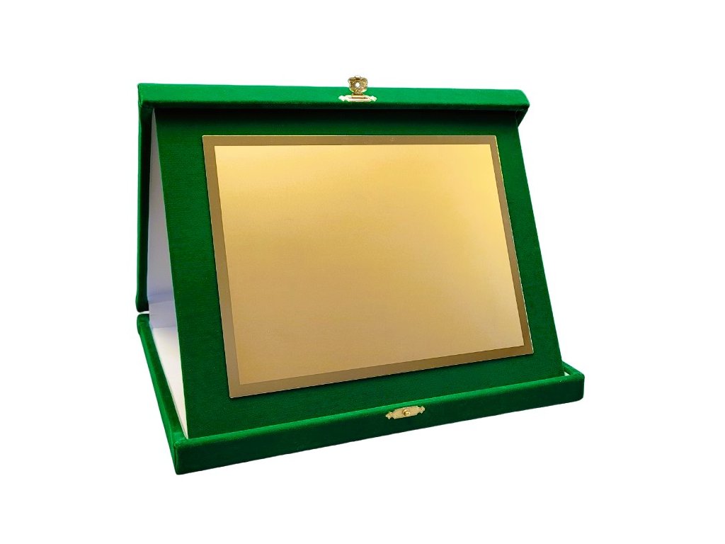 Az elegáns plakett egy zöld bársony tájoló dobozban van elhelyezve. A szublimációs hordozó egy dekoratív lap, amely arany csillogású, oldalain tükrös részletekkel. A plakett kialakítása miatt ideális választás különböző típusú társadalmi eseményekre, különleges sporteseményekre stb. Az ár tartalmazza a szublimálást.