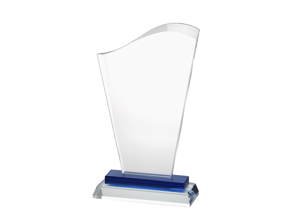 Stílusos kék hatású üveg trófea talapzaton, az üvegre gravírozással. Az üveg kialakításnak köszönhetően ideális választás különböző típusú társadalmi eseményekre, különleges sporteseményekre stb.