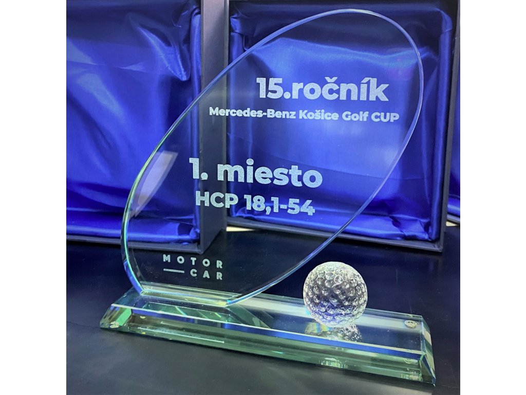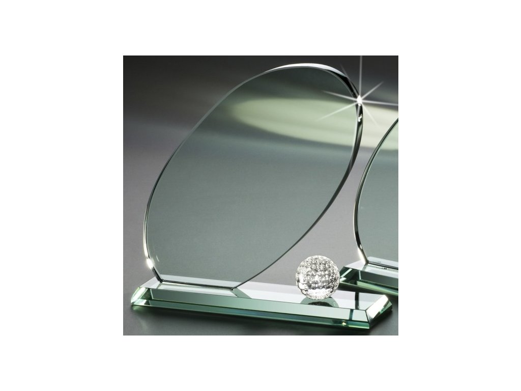 Elegáns üveg trófea golf motívummal üveg alapon, az üvegre gravírozási lehetőséggel. A trófea kialakítása miatt ideális választás különféle társasági eseményekre, különleges sporteseményekre stb.