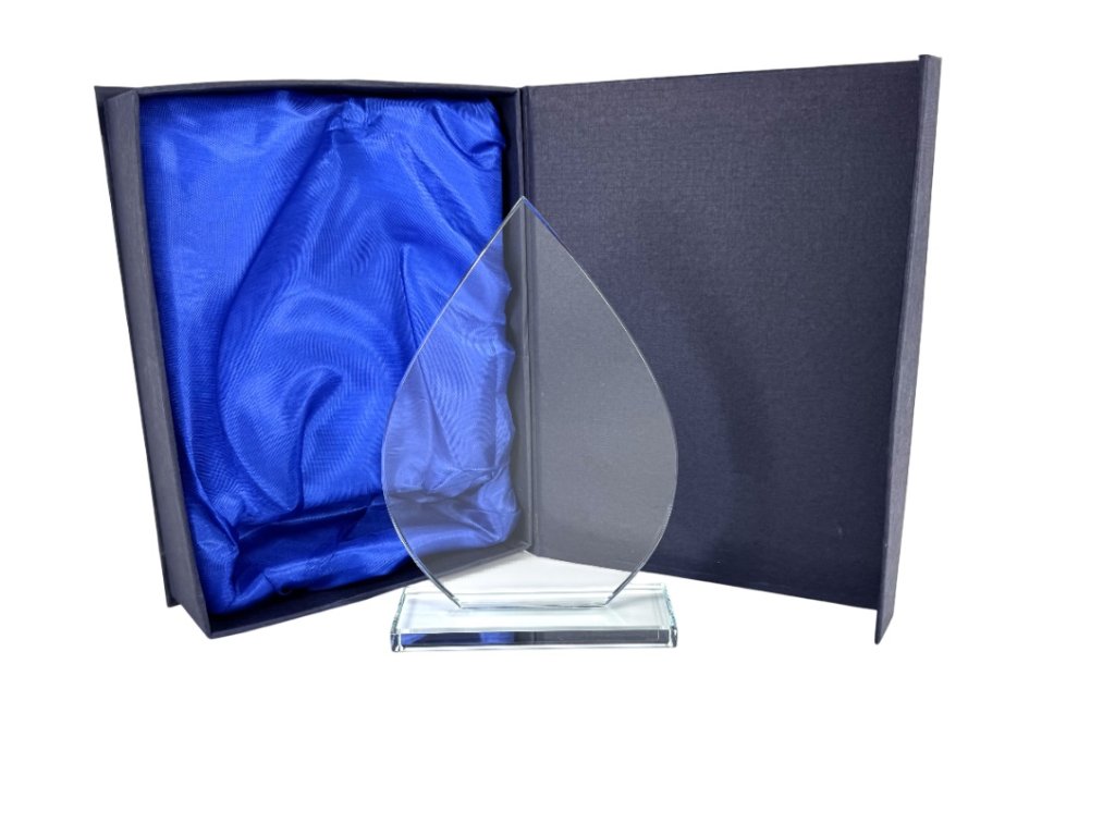 Elegáns üvegtrófea üveg talapzaton, az üvegre történő gravírozás lehetőségével. A trófea kialakítása miatt ideális választás különböző típusú társadalmi eseményekre, különleges sporteseményekre stb.