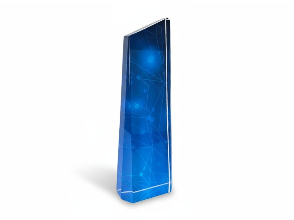 Modern üveg trófea kék absztrakt háttérrel, az üvegre történő gravírozás lehetőségével. Az üveg kialakításnak köszönhetően ideális választás különböző típusú társadalmi eseményekre, különleges sporteseményekre stb.