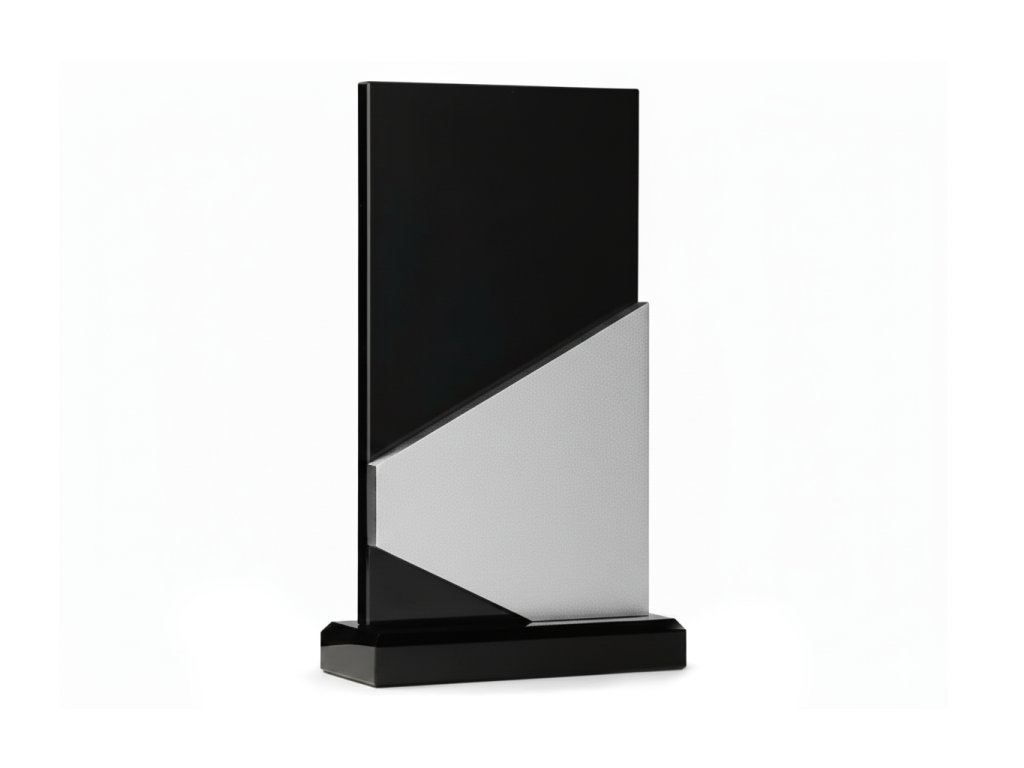 Stílusos üveg aranyszínű fém kiegészítőkkel - elegáns kivitelű alapon, gravírozási lehetőséggel mind az üvegre, mind a fémre. A plakett kialakítása miatt ideális választás különböző típusú társadalmi eseményekhez, különleges sporteseményekhez stb.