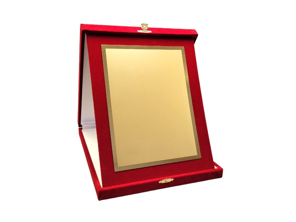 Az elegáns plakett egy vörös bársony portré orientációs dobozban van elhelyezve. A szublimációs hátlap egy dekoratív lap, amely arany csillogású, oldalain tükörrel díszített részletekkel. A plakett kialakítása miatt ideális választás különböző típusú társadalmi eseményekre, különleges sporteseményekre stb. Az ár tartalmazza a szublimálást.