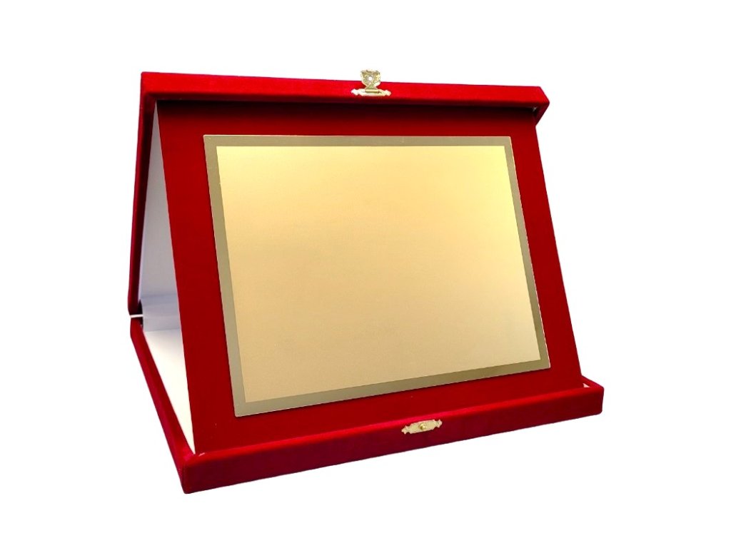 Az elegáns emléktábla egy vörös bársony, tájképi tájolású dobozban van elhelyezve. A szublimációs hordozó egy dekoratív lap, amely arany csillogású, oldalain tükrös részletekkel. A plakett kialakítása miatt ideális választás különböző típusú társadalmi eseményekre, különleges sporteseményekre stb. Az ár tartalmazza a szublimálást.