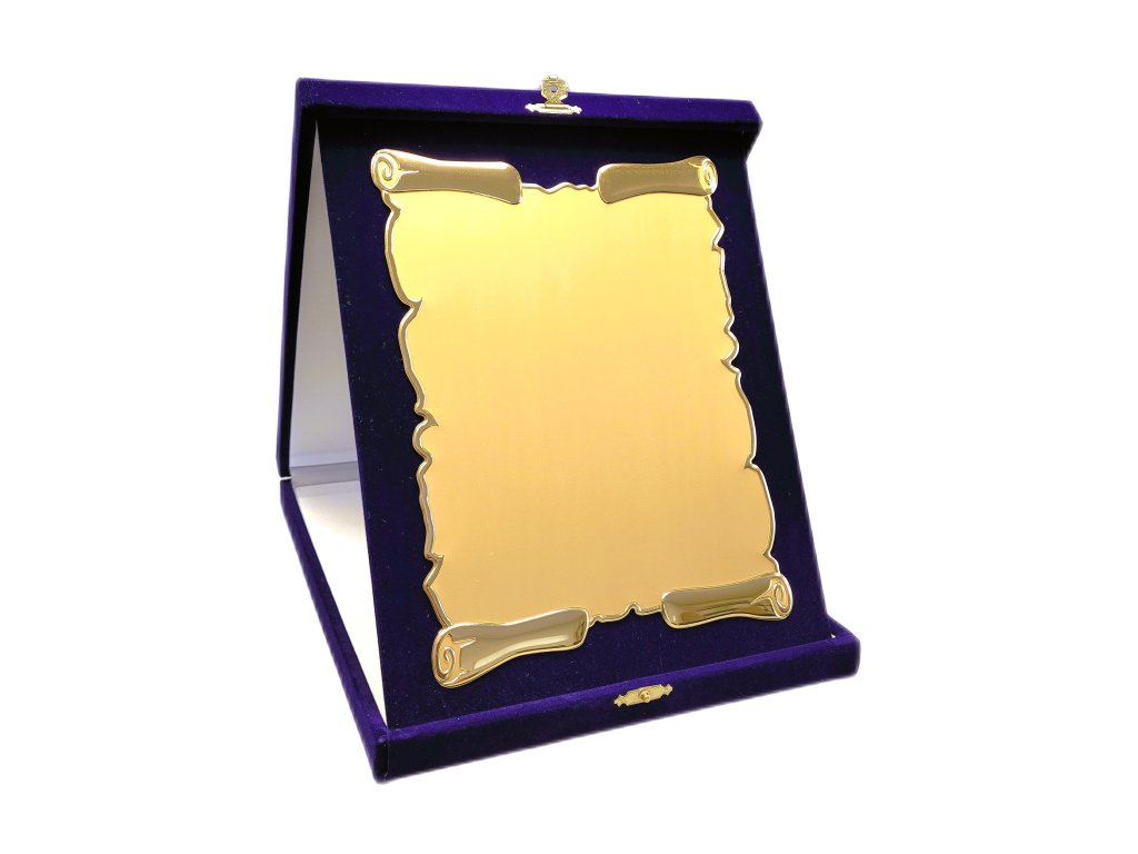 Az elegáns plakett egy kék bársony portréorientált dobozban van elhelyezve. A szublimációs hordozó egy dekoratív lap, amely aranyfényű, enyhén 3D-s papiruszhatású. A plakett kialakítása miatt ideális választás különböző típusú társadalmi eseményekhez, különleges sporteseményekhez stb. Az ár tartalmazza a szublimálást.