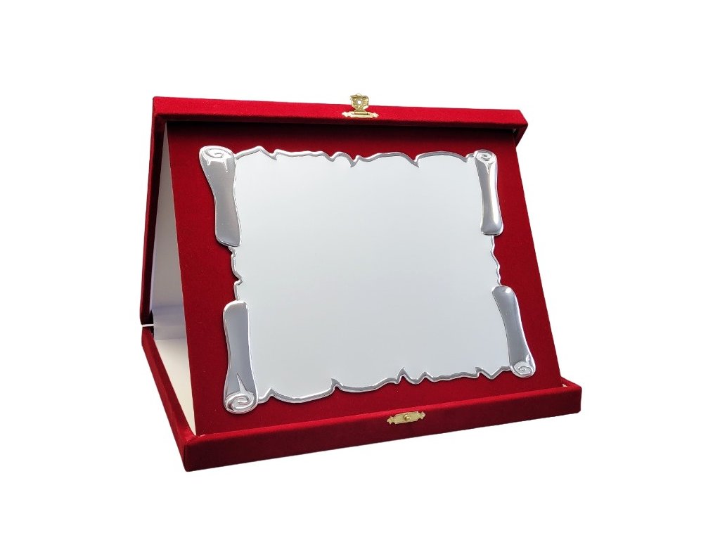 Az elegáns emléktábla egy vörös bársony, tájképi tájolású dobozban van elhelyezve. A szublimációs hordozó egy dekoratív lap, amely ezüstös fényű, enyhe 3D papirusz hatású. A plakett kialakítása miatt ideális választás különböző típusú társadalmi eseményekhez, különleges sporteseményekhez stb. Az ár tartalmazza a szublimálást.