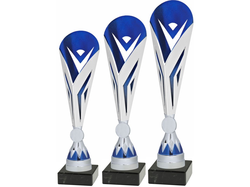 A pohárkészlet modern dizájnját a márványalapra helyezett kehely egyedi formája teremti meg. Ideális választás minden sportághoz, és kiegészíthető a talapzaton elhelyezett emblémával (25mm) + gravírozott címkével. A változatok 3 méretben kaphatók a díjazottak sorrendjének fokozatossága érdekében.
