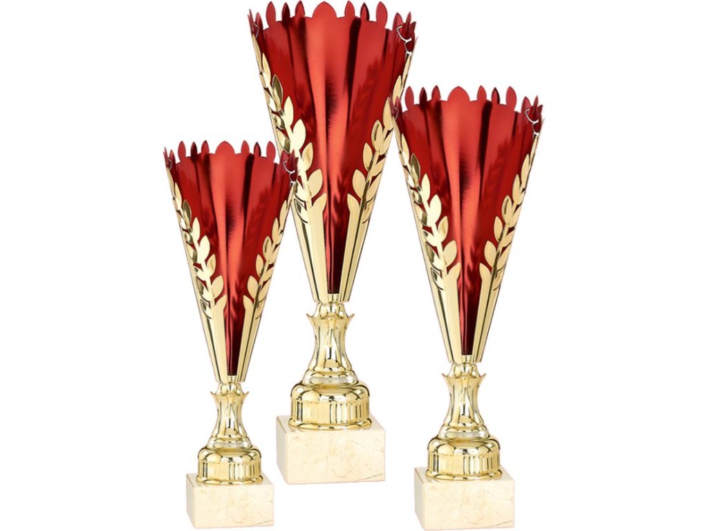 A pohárkészlet stílusos kialakítását a márványalapra helyezett kehely körüli domináns díszítés adja. Ideális választás minden sportághoz, és kiegészíthető a talapzaton elhelyezett gravírozott címkével. A készlet 3 méretben kapható a díjazottak sorrendjének fokozatos leosztásához.