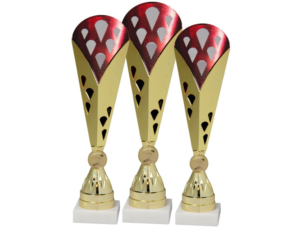 A poharak modern kialakítása egyedi formát kölcsönöz a kehelynek, amely márvány alapra van helyezve. Ideális választás minden sporttípushoz, és kiegészíthető a talapzaton elhelyezett emblémával (25 mm) + gravírozott címkével. A változatok 3 méretben kaphatók a díjazottak sorrendjének fokozatos leosztásához. Ez a trófea egy egyén vagy csapat sport- vagy egyéb ágazatban elért eredményéért és diadaláért adományozható.