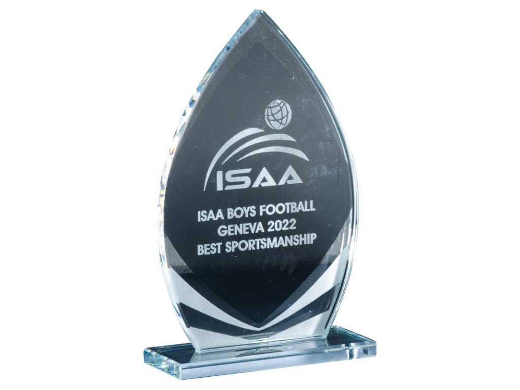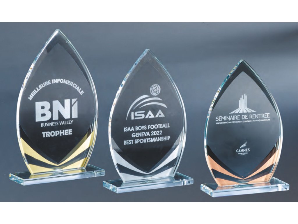 Elegáns üveg trófea három méretben, alulról hatásos (arany, ezüst és bronz üvegcsíkok), elegáns kivitelben, az üvegre gravírozás lehetőségével. Az üvegdizájn ideális választás különféle társasági eseményekhez, különleges sporteseményekhez stb.