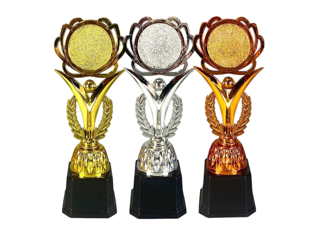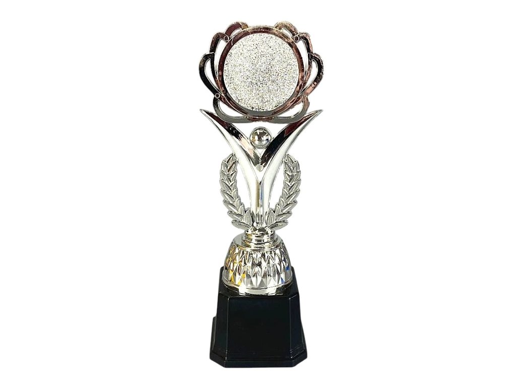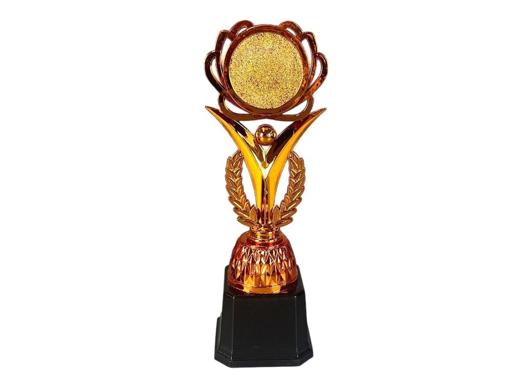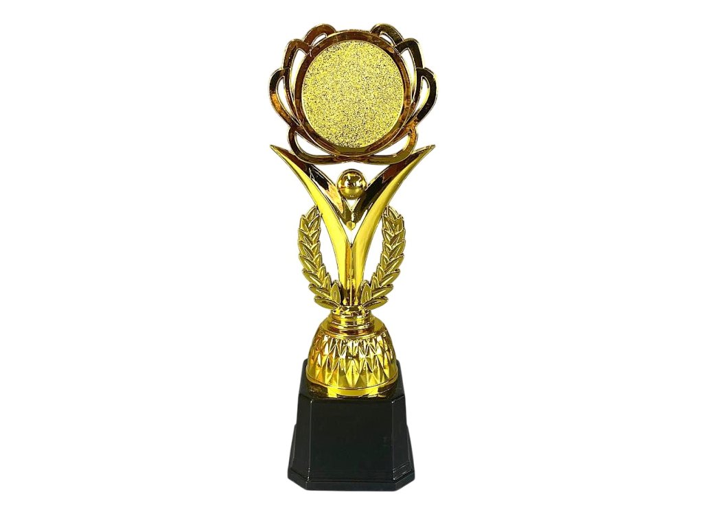 Egyedi trófea figurával - emblémahordozóval (50mm), talapzatra szerelve, a talapzatra gravírozott tábla elhelyezésének lehetőségével. Az Ön által választott embléma elhelyezhető a hordozón.