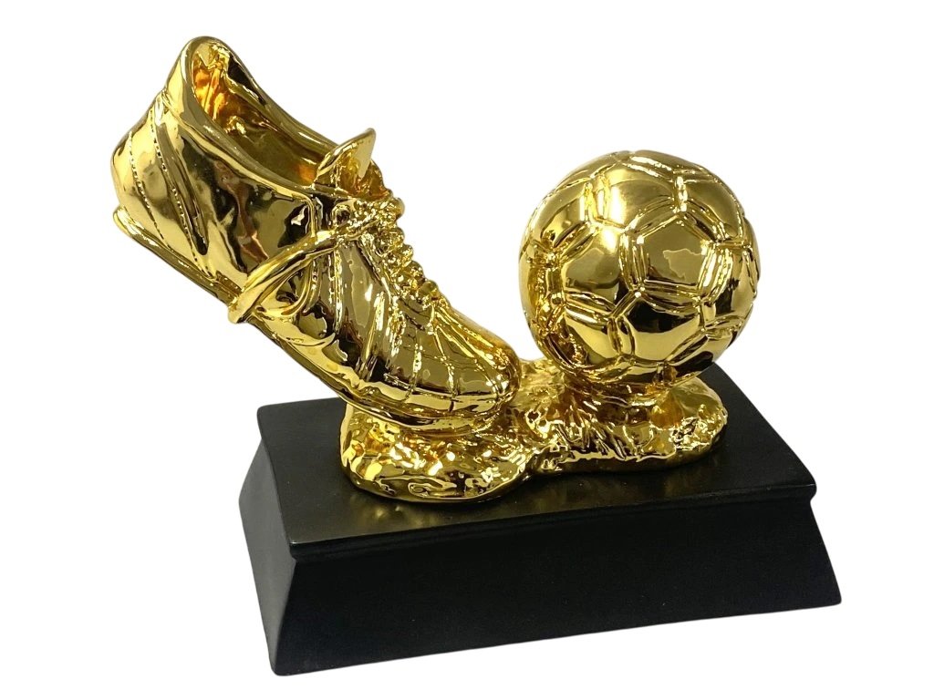 Egyedi műgyanta trófea futball/foci motívummal és a talapzatra gravírozott tábla elhelyezésének lehetőségével. Ideális választás a legjobb futballista vagy futballrajongó díjazására.