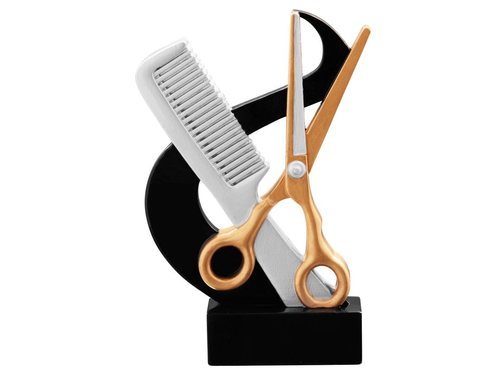 A trófea egyedi megjelenését a talapzaton elhelyezett különleges olló és fésű motívum adja, amelyre gravírozott címke helyezhető. A trófea ideális a fodrászok/fodrászok/fodrászok/fodrászok díjazására.