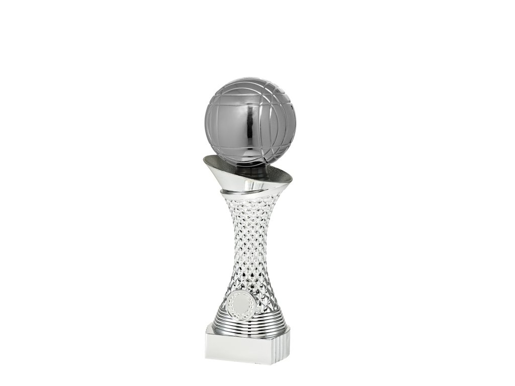 A trófea stílusos megjelenését az egyedi ezüst talapzat adja, amelyen egy petanque-motívummal díszített ezüst figura található. A trófea kiegészíthető egy emblémával (nem tartozék) + a talapzat aljára helyezett gravírozott lemez lehetőségével. A díjazottak sorrendjének osztályozásához 3 méretben állnak rendelkezésre változatok.