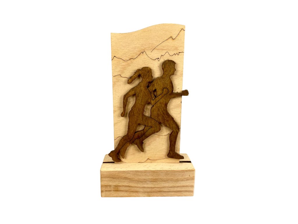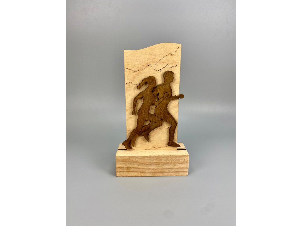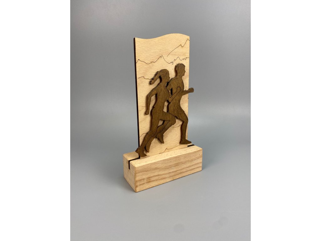 Elegáns fa trófea futó motívummal fa alapon, gravírozási lehetőséggel közvetlenül a fára.