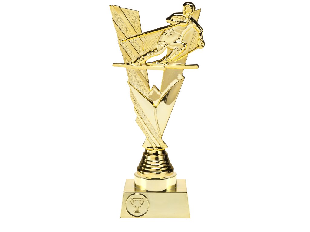 Stílusos arany trófea lesiklás motívummal és gravírozott lemez elhelyezésének lehetőségével az alapon + embléma elhelyezésének lehetőségével az alapon (25mm). A trófea kiváló választás bármilyen sport- vagy társadalmi esemény díjazására.