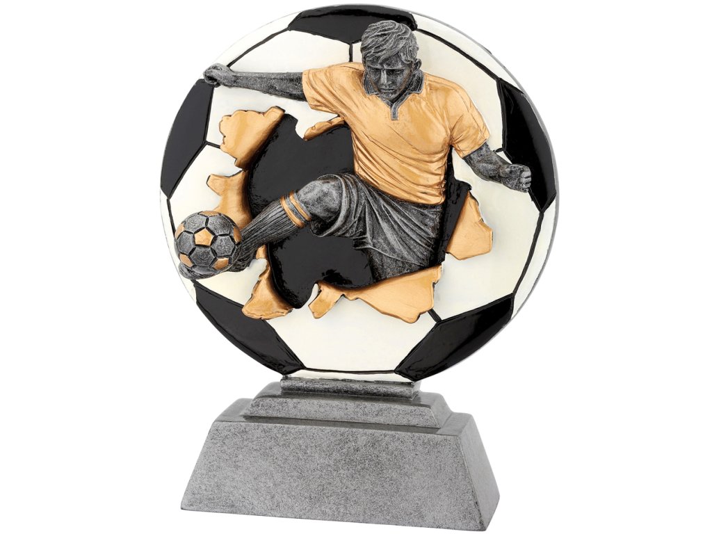 Stílusos műgyanta trófea futball motívummal és a talapzatra gravírozott tábla elhelyezésének lehetőségével.