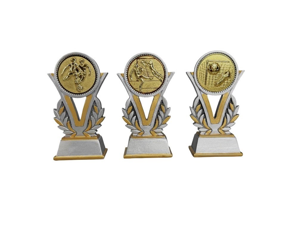 Egyedi műgyanta trófeakészlet futballista, kapus és kapus 3D-s emblémájával (50 mm átmérőjű), valamint lehetőség van gravírozott címkék elhelyezésére az alapokon. A készlet 2 méretben kapható.