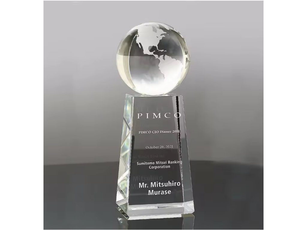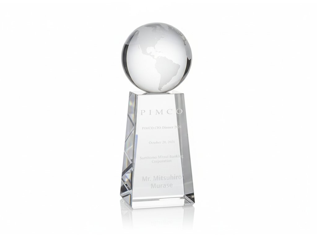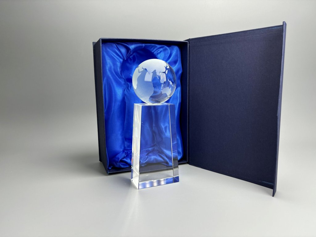 Elegáns üvegtrófea a tetejébe ágyazott átlátszó földgömbbel, az alján gravírozási lehetőséggel. Az üveg kialakításnak köszönhetően ideális választás különböző típusú társadalmi eseményekre, különleges sporteseményekre stb.