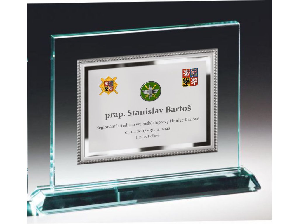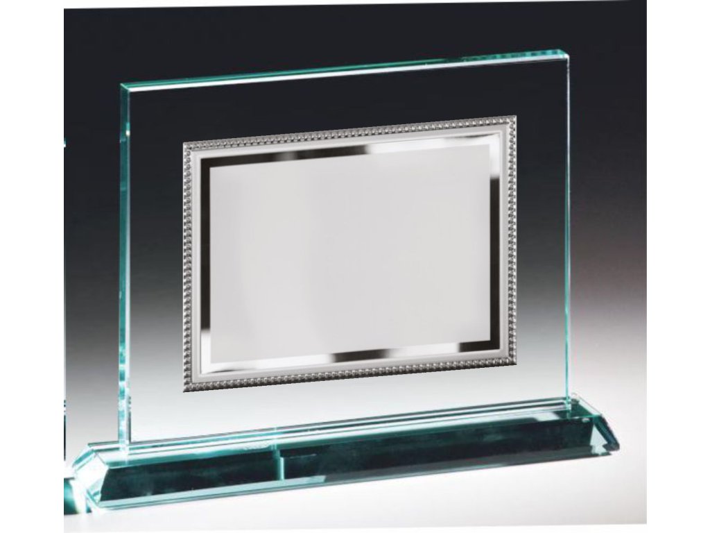 Stílusos üveg trófea ezüst plakettel, melyre ezüst plakett van ragasztva, az ár tartalmazza a plakettre történő színes grafika szublimáció lehetőségét. Az üvegből készült kialakításnak köszönhetően ideális választás különféle társasági eseményekhez, különleges sporteseményekhez stb.