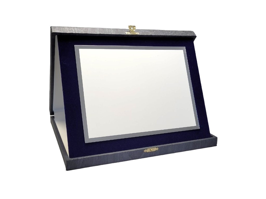 Az elegáns emléktábla egy szürke és kék, tájba illő dobozban van elhelyezve. A szublimációs hátlap egy fehér dekoratív lap, amelynek oldalain ezüst tükrös részletek találhatók. A plakett kialakítása miatt ideális választás különböző típusú társadalmi eseményekre, különleges sporteseményekre stb. Az ár tartalmazza a szublimálást.
